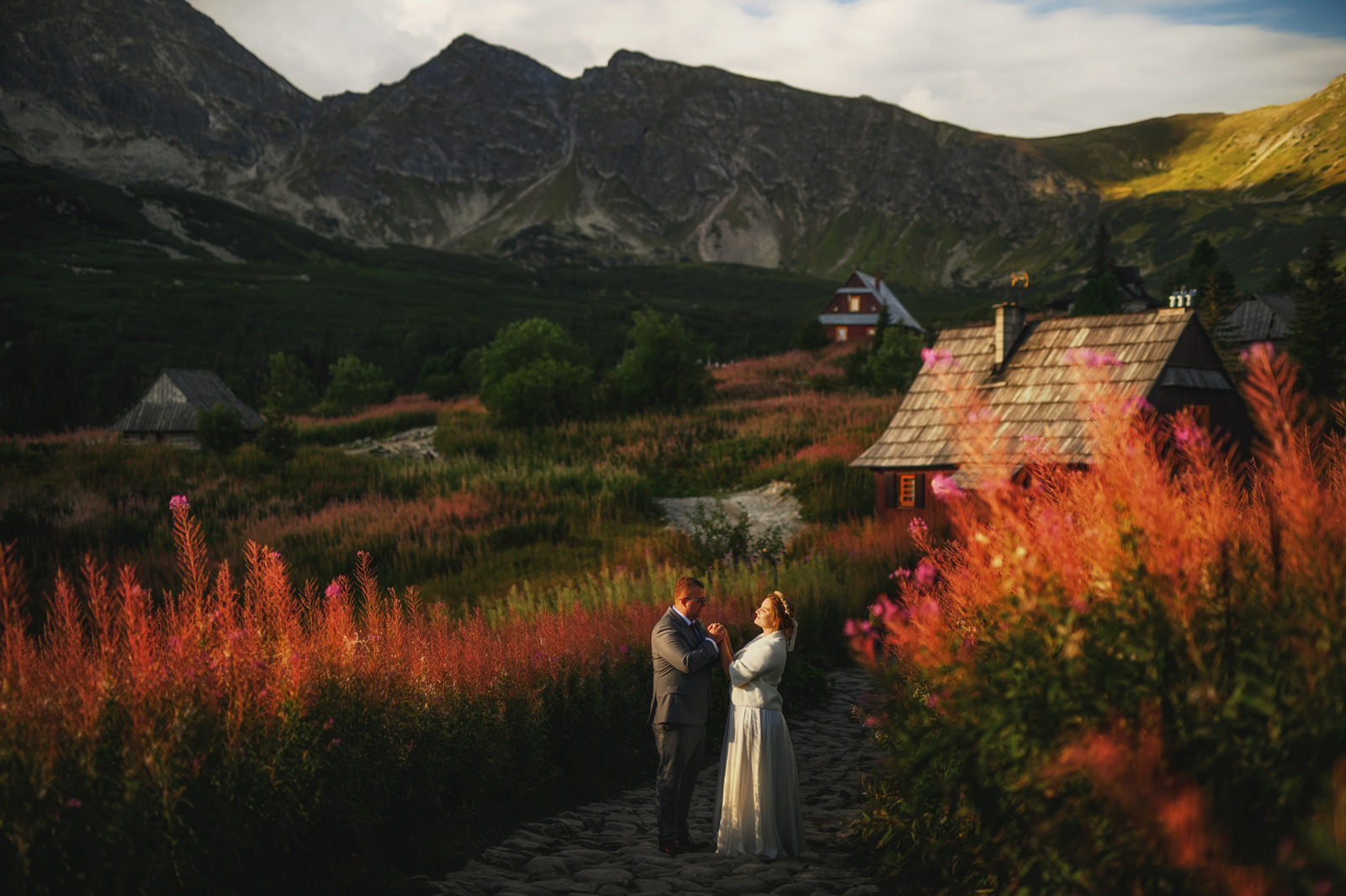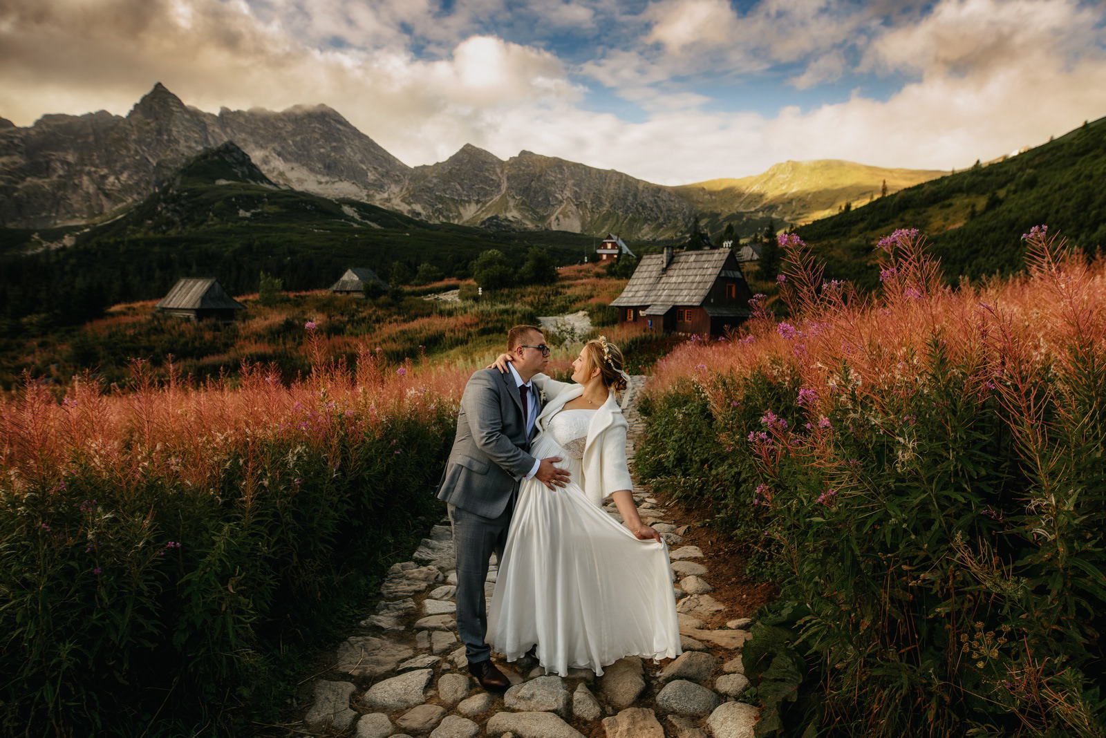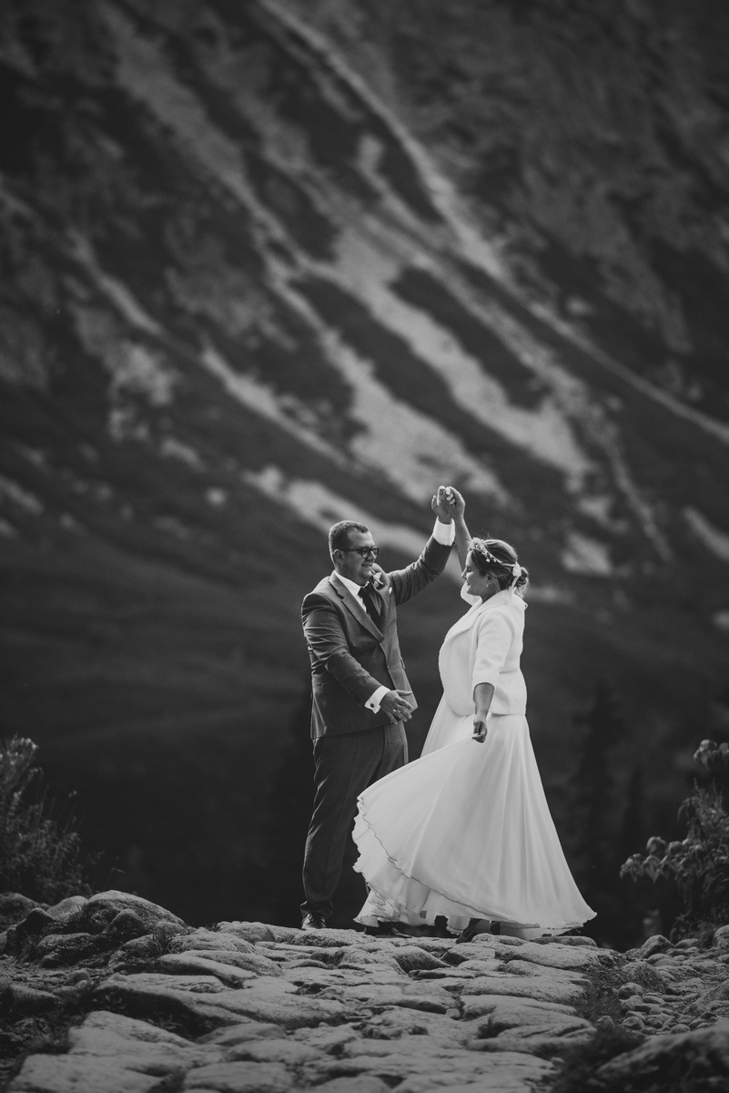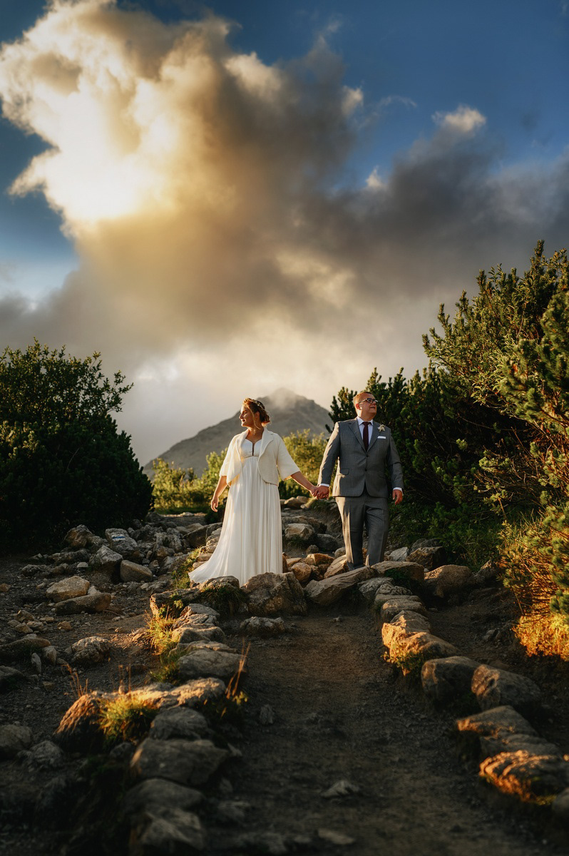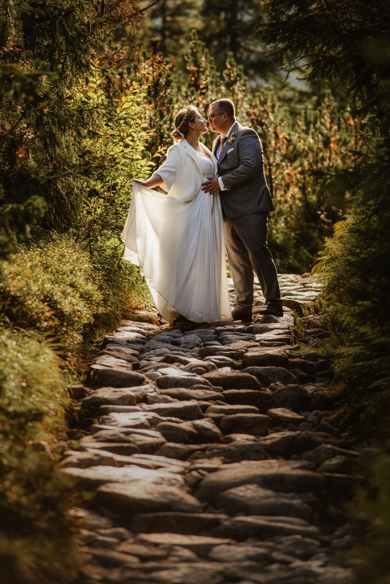 Sesja poślubna o wschodzie słońca na malowniczej Hali Gąsienicowej.